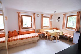 Ausstattung: Doppelbett, Zustellbett, Babybett, Doppelschlafcouch, Balkon, Terrasse, Garten, Bettwäsche vorhanden, Wohnküche, Kaffeemaschine, Elektroherd, Geschirrausstattung, Dusche/Bad, Badetücher, TV, Reinigung auf Anfrage, Saisonsmiete möglich, Haupthaus, Südseite